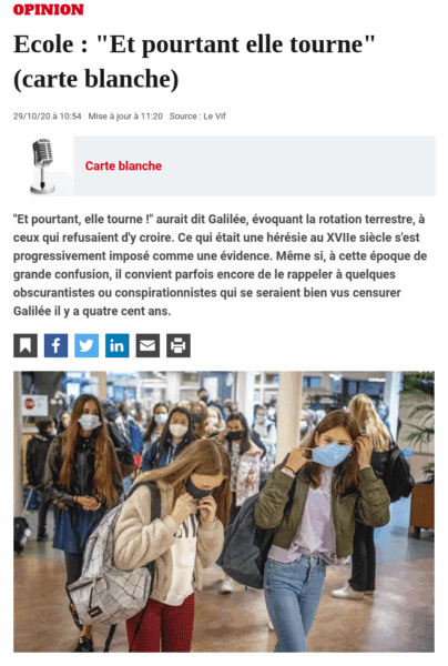 Et pourtant, elle tourne ! Même si elle peine à contrecarrer la diffusion des fake news amplifiée par les nouvelles technologies, elle donne les bases d’un esprit critique qui permet d’outiller un minimum les citoyens de demain pour y faire face. Et pourtant, elle tourne ! Même dans cette funeste période où nous sommes contraint·e·s de réduire drastiquement nos contacts, elle offre la possibilité aux élèves de maintenir un peu de lien social et de préserver des amitiés voire des amours naissants.