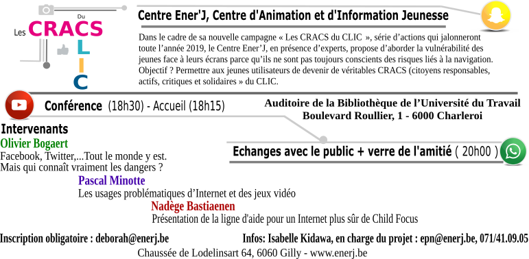 Dans le cadre de sa campagne « Les CRACS du CLIC », le Centre Ener’J organise une importante série d’actions (conférences, ciné-débats, journées d’échanges autour d’outils éducatifs….) destinés aux jeunes, aux enseignants, aux professionnels ainsi qu’aux parents.